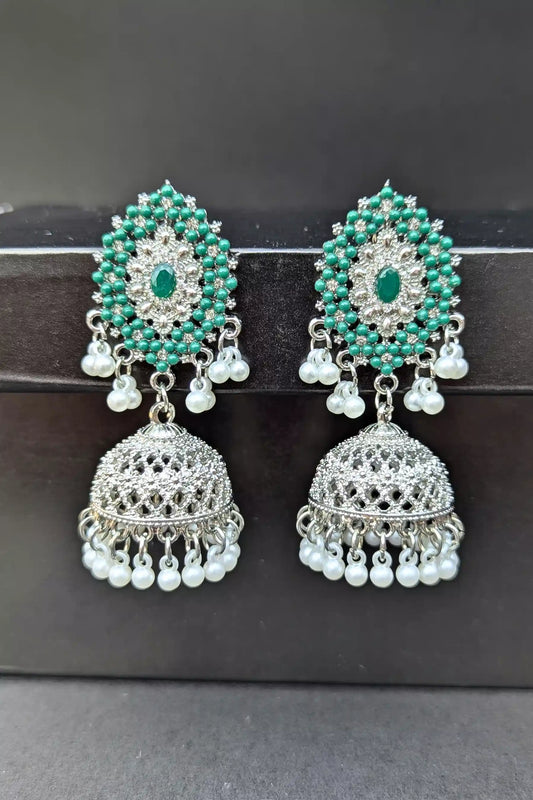 Golden and Green Jhumkay for Girls – Traditional Earrings with White Pearl Detailing