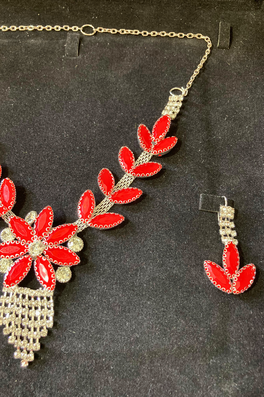 Dazzling Red Floral Necklace and Earrings Set