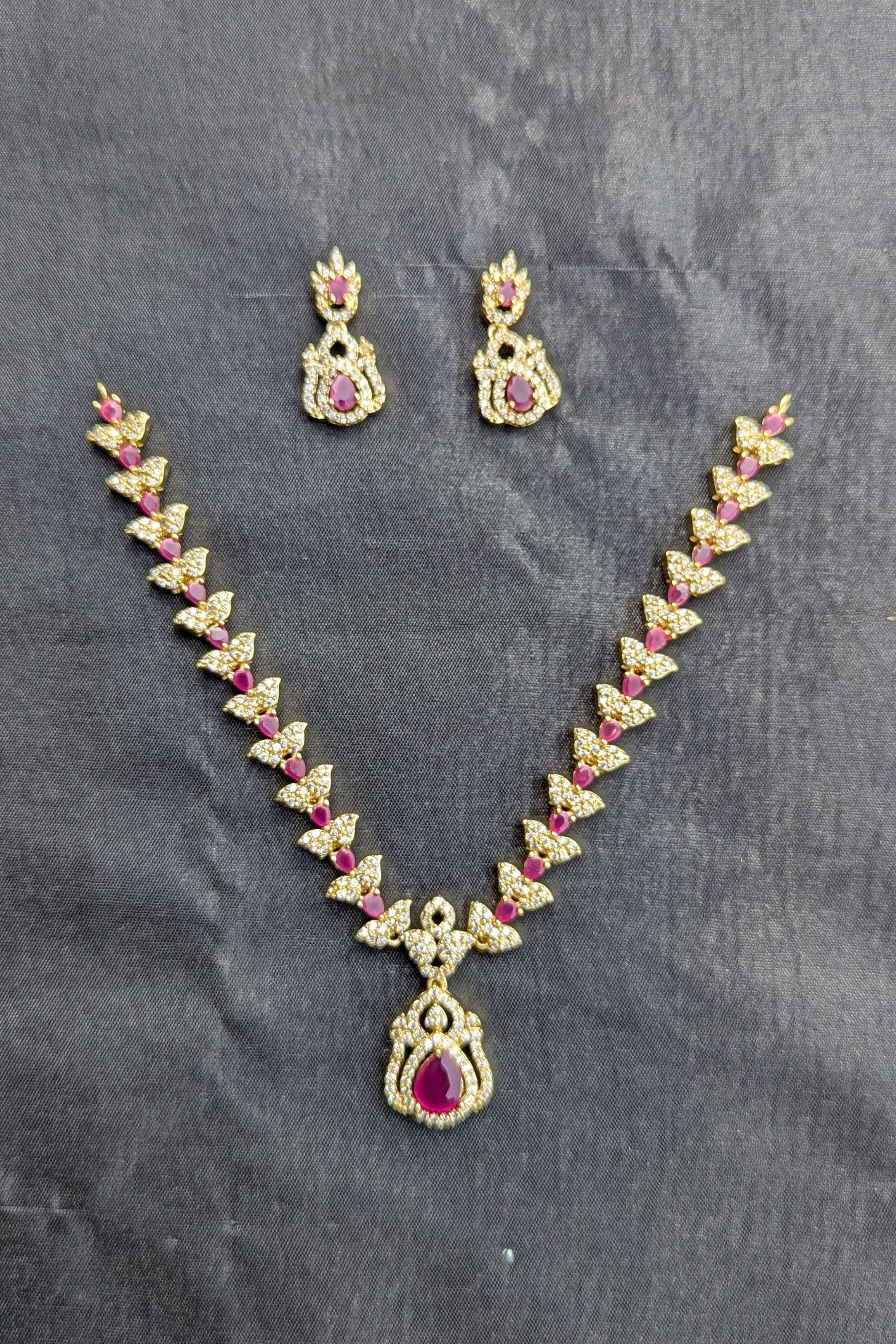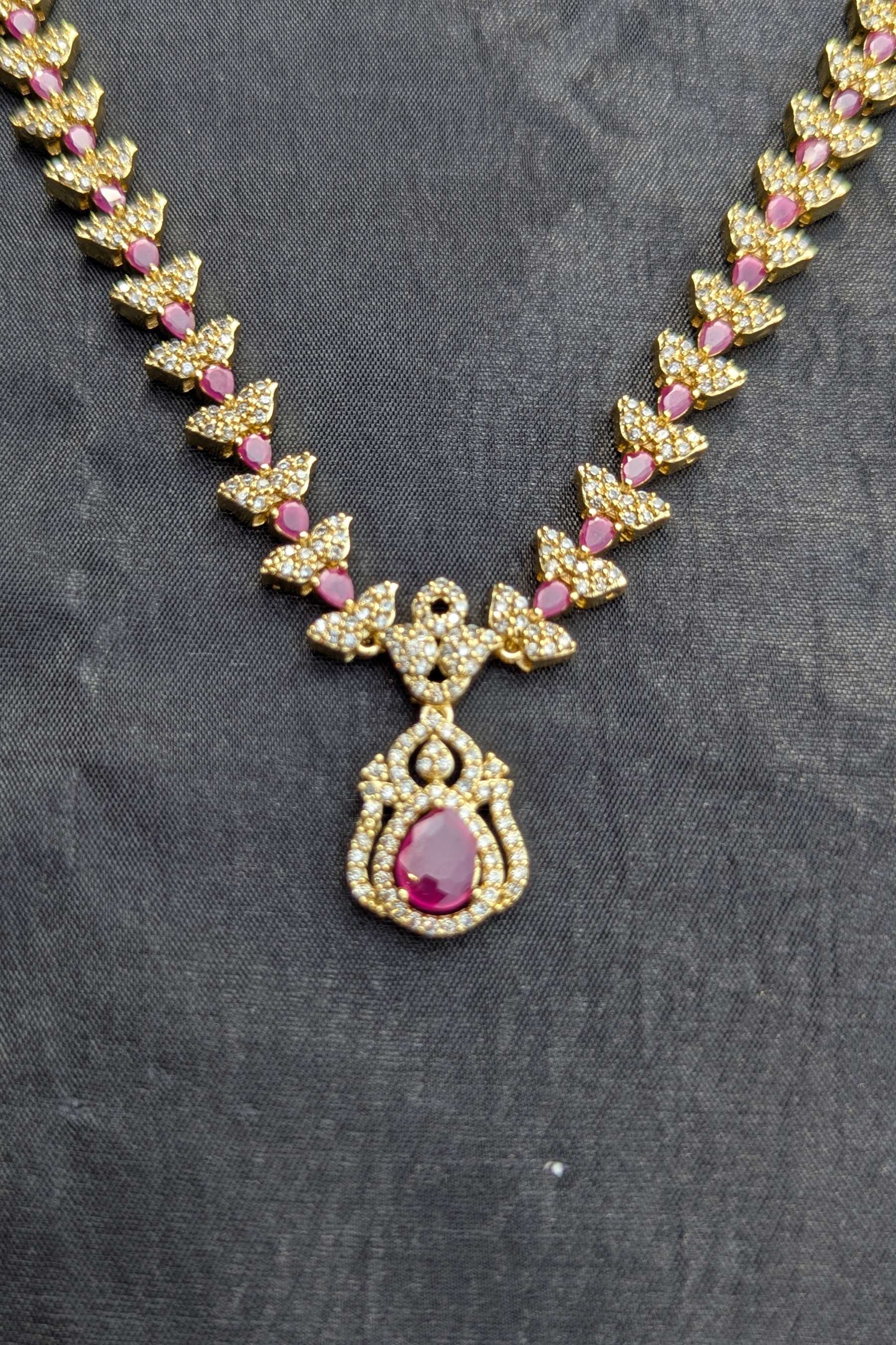 This gorgeous gold necklace set is all about elegance and timeless beauty. Designed with intricate butterfly-inspired motifs and dazzling clear crystals, each piece is accented with rich 1-carat ruby pink stones that radiate royalty. The center pendant adds a grand finishing touch, while the matching earrings complete the look with effortless charm.
