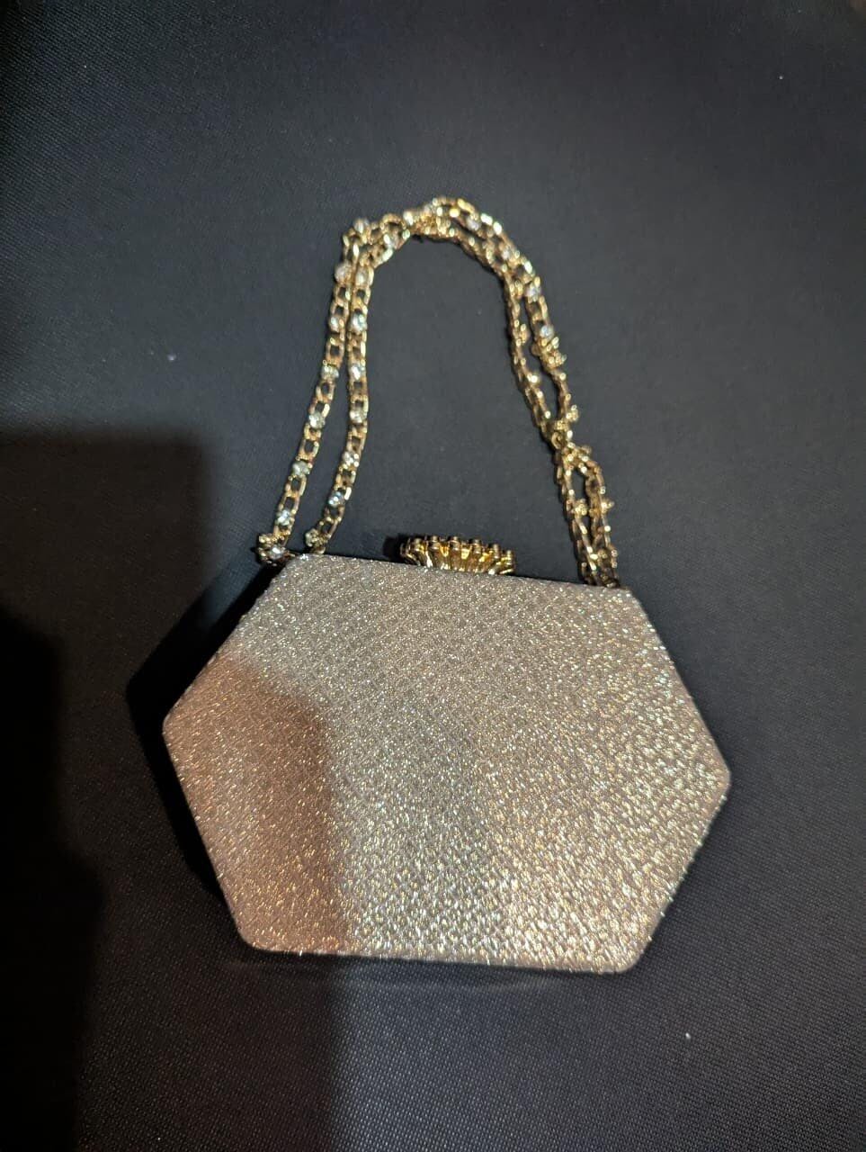 Make your wedding day look extra special with this beautiful silver fancy bridal clutch bag. Designed in a unique hexagon shape, this purse adds a stylish edge to any bridal or festive outfit. The soft champagne gold tone gives it a graceful shine, while the sparkling chain strap with pearl detailing adds just the right amount of glamour.