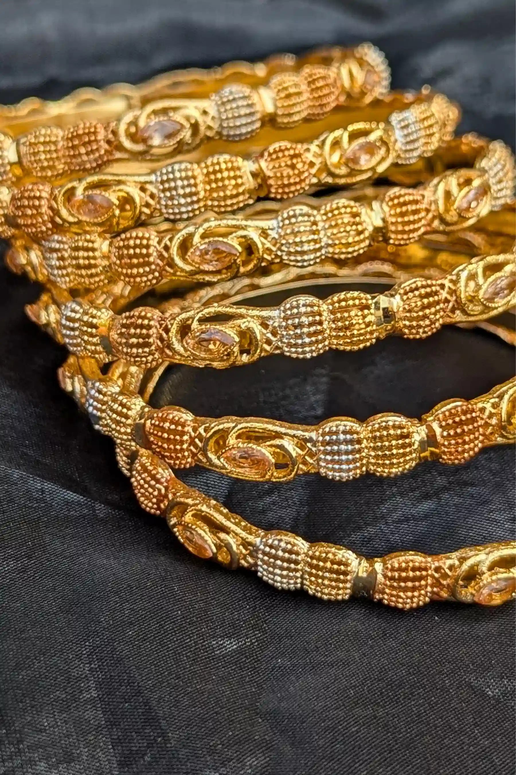 These Golden Champagne Pearl Bangles from Valentina Jewelry bring a perfect mix of elegance and style. Designed with a stunning golden and silver color combination, each bangle is decorated with soft champagne pearls that add a classy shine to your look. The round net design makes these bangles for girls stand out beautifully, giving them a rich and timeless appeal.
