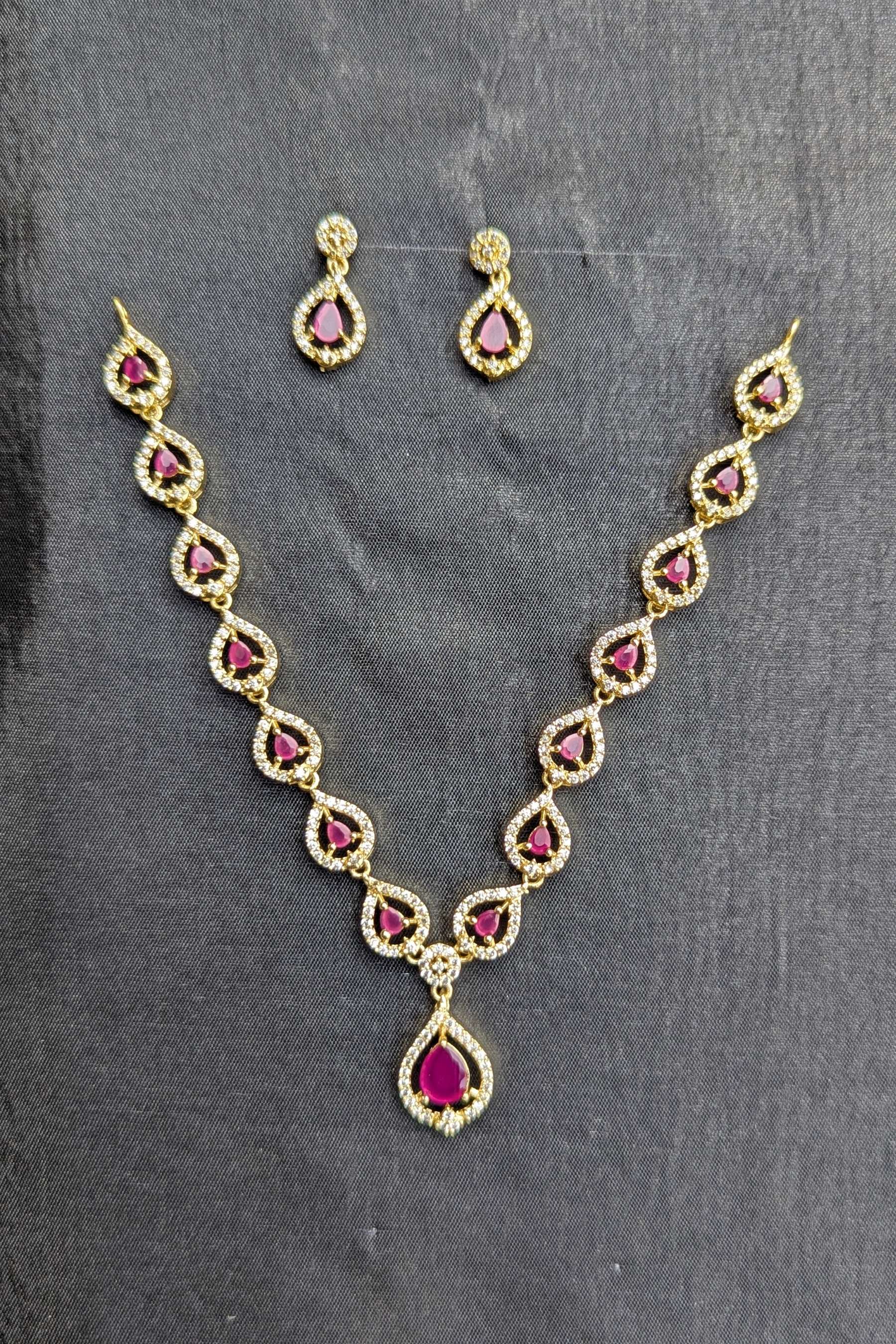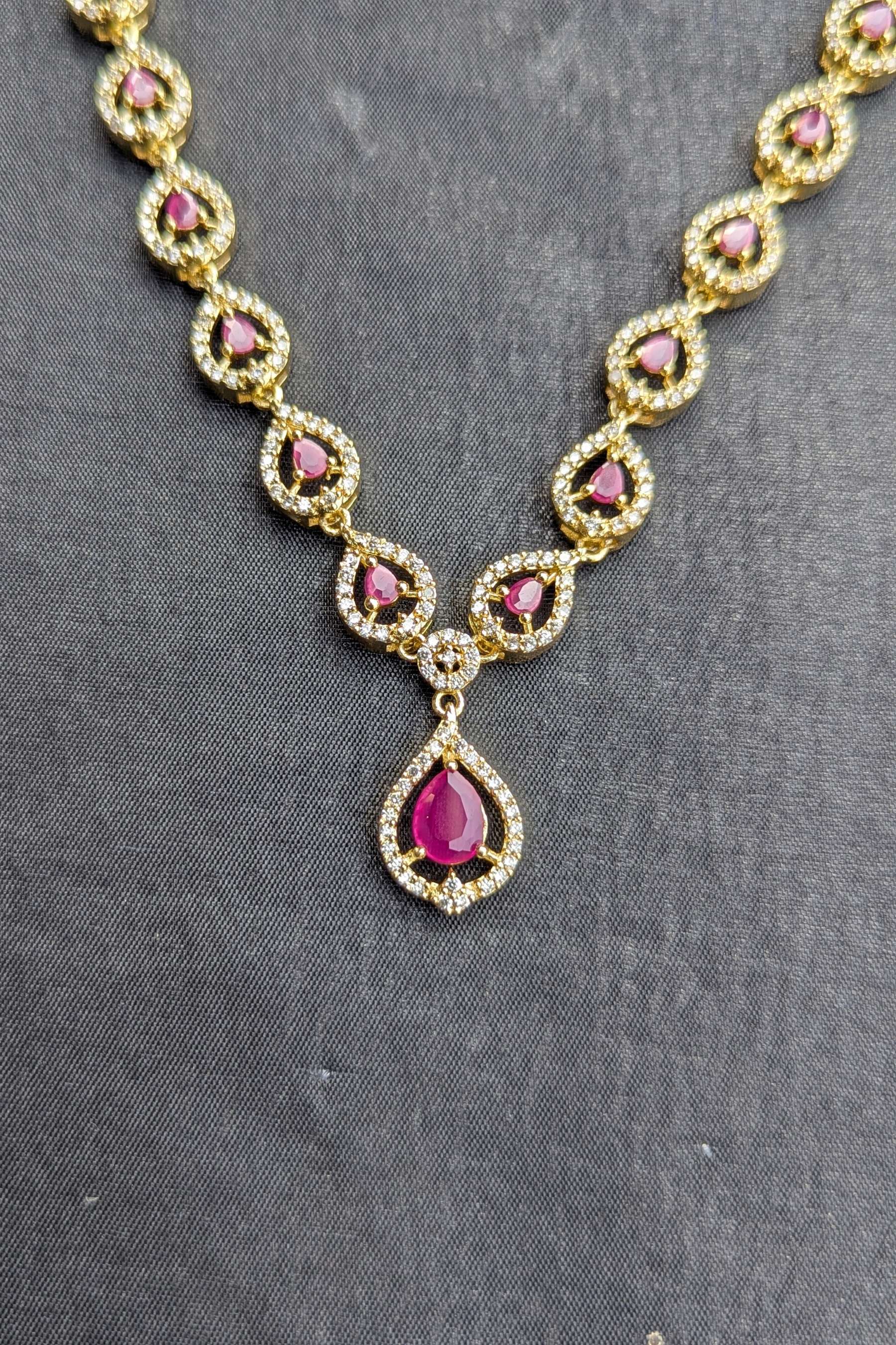 Exuding an aura of timeless grace, the Royal Ruby Teardrop Necklace Set is a symphony of elegance and simplicity. Each teardrop-shaped ruby-hued stone is encased in a dual halo of sparkling micro-pavé zirconia, set against a warm gold-tone base. The necklace culminates in a striking central pendant, creating a seamless blend of sophistication and style.